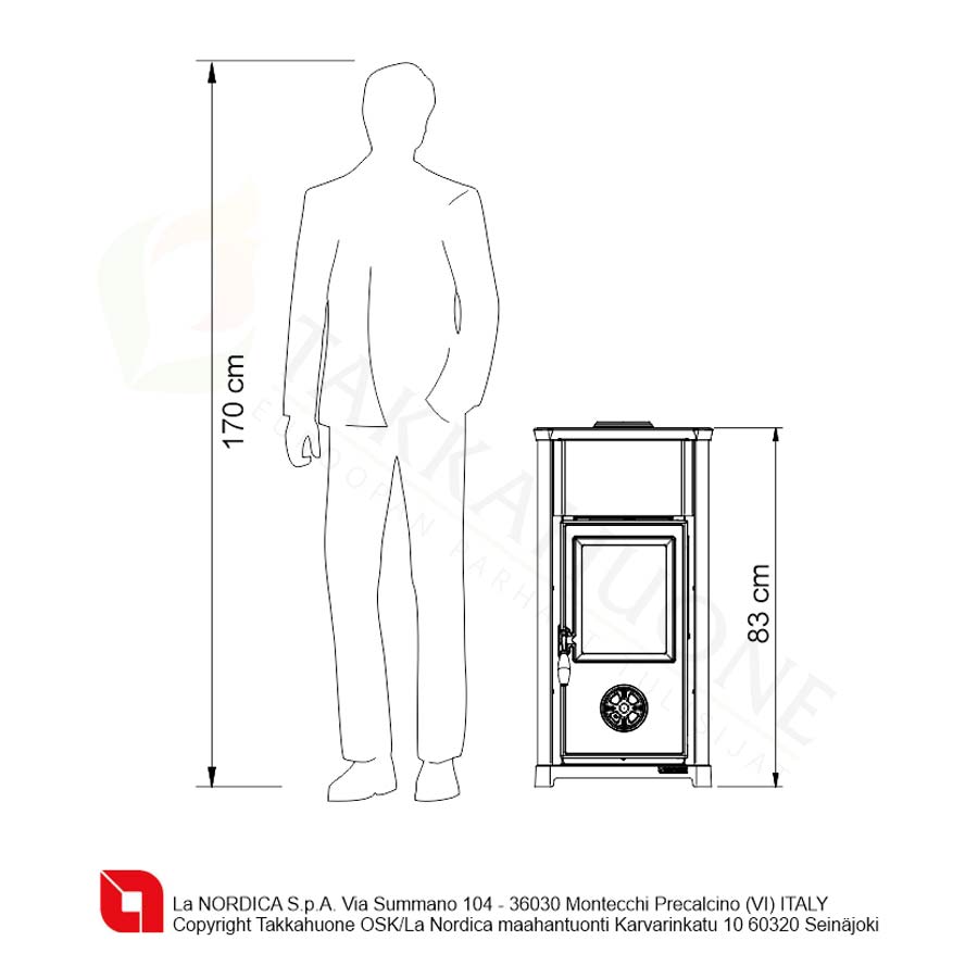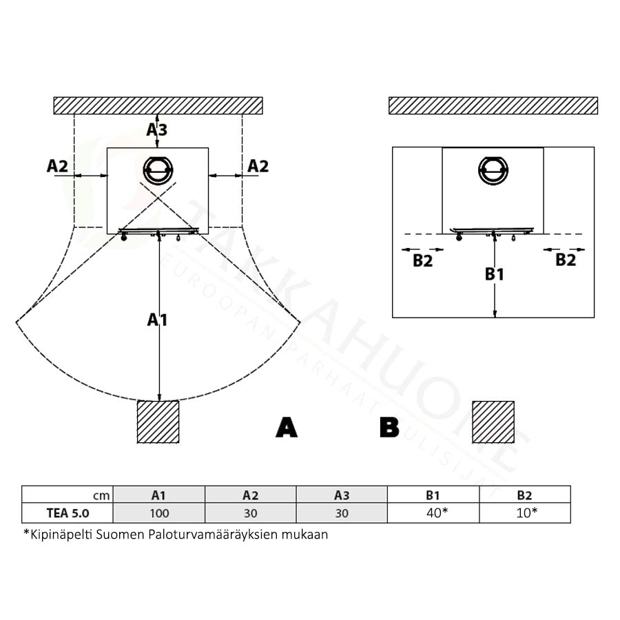 *Edessä olevan lattian osalta noudatetaan Suomen paloturvalakia (kipinäsuoja 400 mm eteen, 100 mm sivuille luukusta). Vaikka tuotteelle olisi annettu suojaetäisyydeksi 0 mm, se ei kumoa paloturvalakiin määriteltyä kipinäpellin vaatimusta.