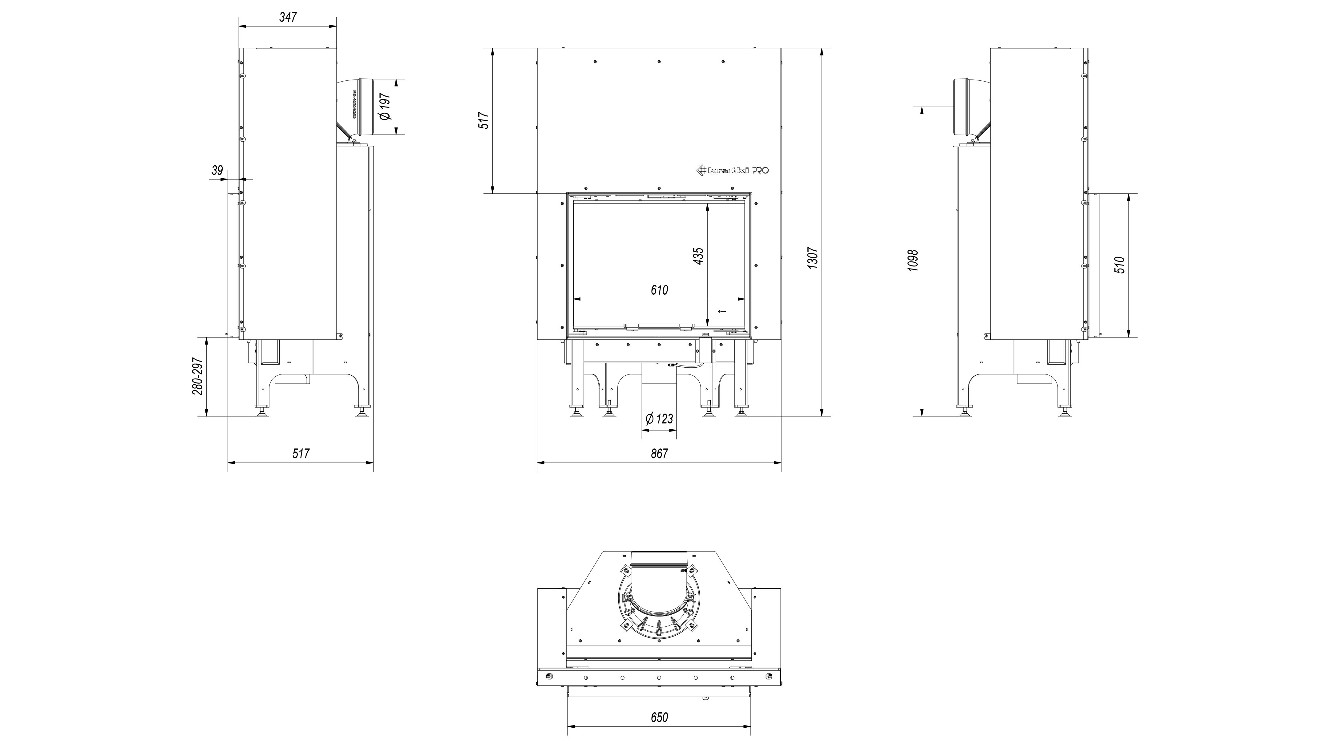 Perusmallin edullinen mutta edistyksellinen tulipesä upotetun tai kuorellisen takan rakentamiseen.