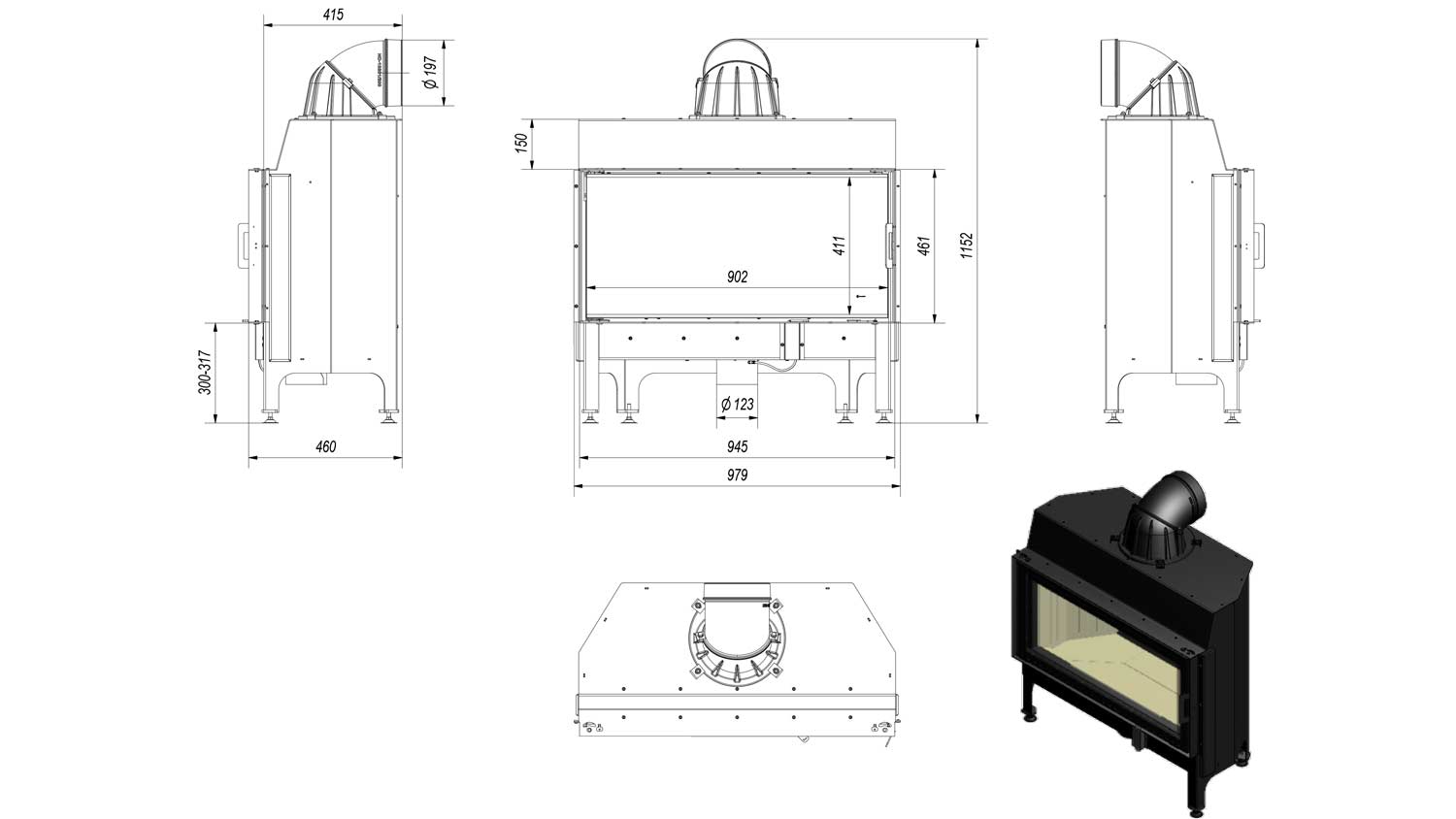 Perusmallin edullinen mutta edistyksellinen tulipesä upotetun tai kuorellisen takan rakentamiseen.