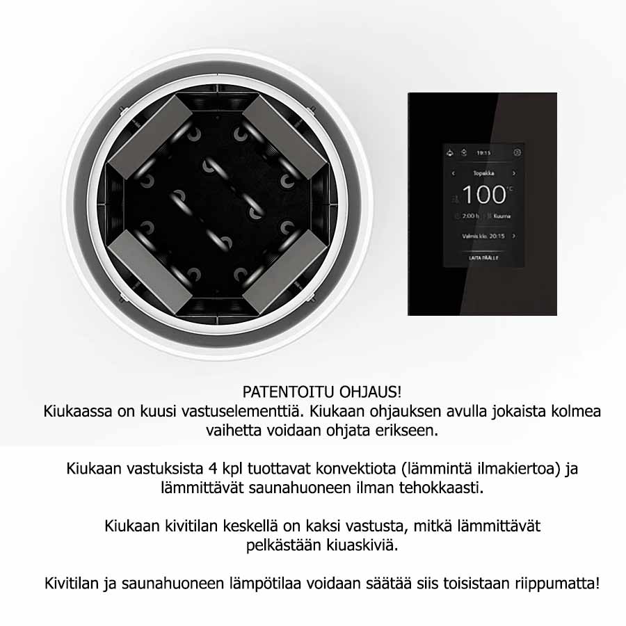 Kiukaidemme innovatiivinen vastusasettelu ja uusi ohjausjärjestelmä mahdollistavat täysin personoidun saunomiskokemuksen. Voit säätää löylyn laatua oman mieltymyksesi mukaan saunahuoneen lämpötilasta riippumatta. Tämä takaa tasaisemman ja miellyttävämmän lämpötilan saunassasi.