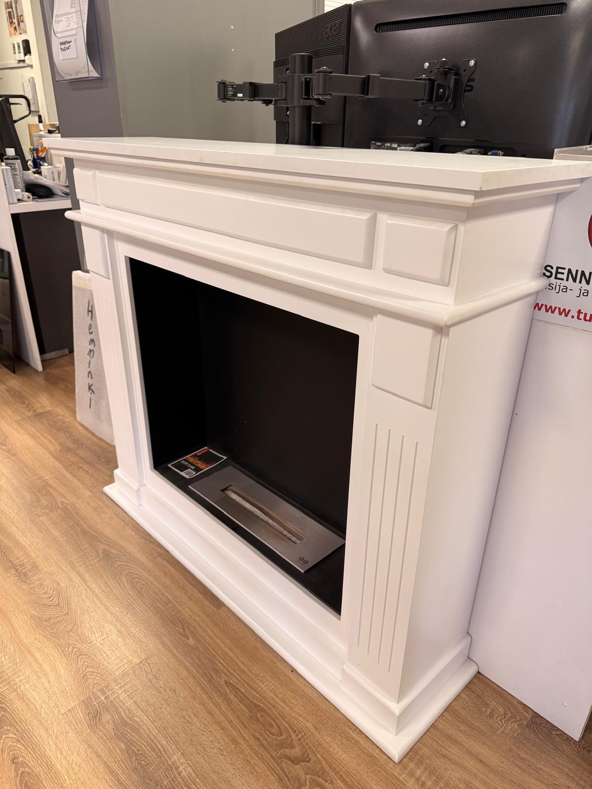 Lattialle, seinää vasten asennettava kookas manttelimallin biotakka. Käsin valmistettu MDF kotelo, joka on maalattu mattavalkoiseksi. Sopii tunnelman tuojaksi mihin tahansa tiloihin. Poltin ruostumatonta terästä. Polttimen sisällä keraaminen villa, joka estää roiskumisen mikäli tuote kaatuu tai putoaa pöydältä.