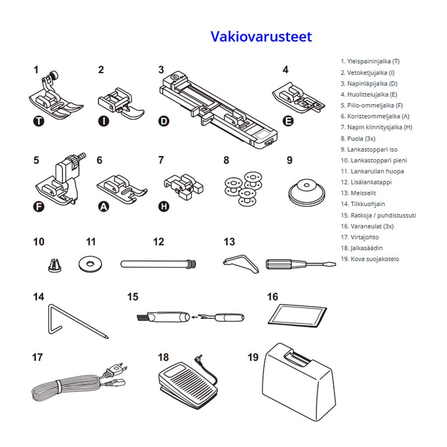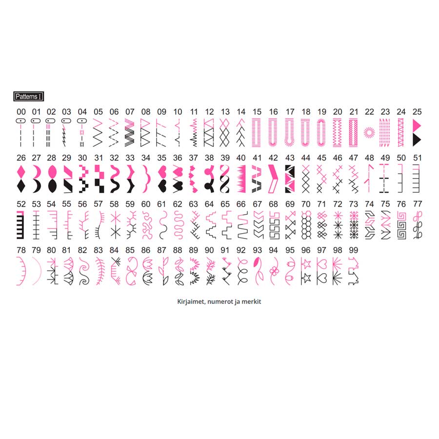Yksinkertainen ja helppo käyttää. Pikaohjeista löydät kaikki ompeleet, kirjaimet ja numerot. Etupaneelin pikavalinnasta saat vieläpä perusompeleet. Start-stop, nopeudensäätö, neula-stop ja kaksi eri päättelyä varmistavat siistin viimeistelyn.