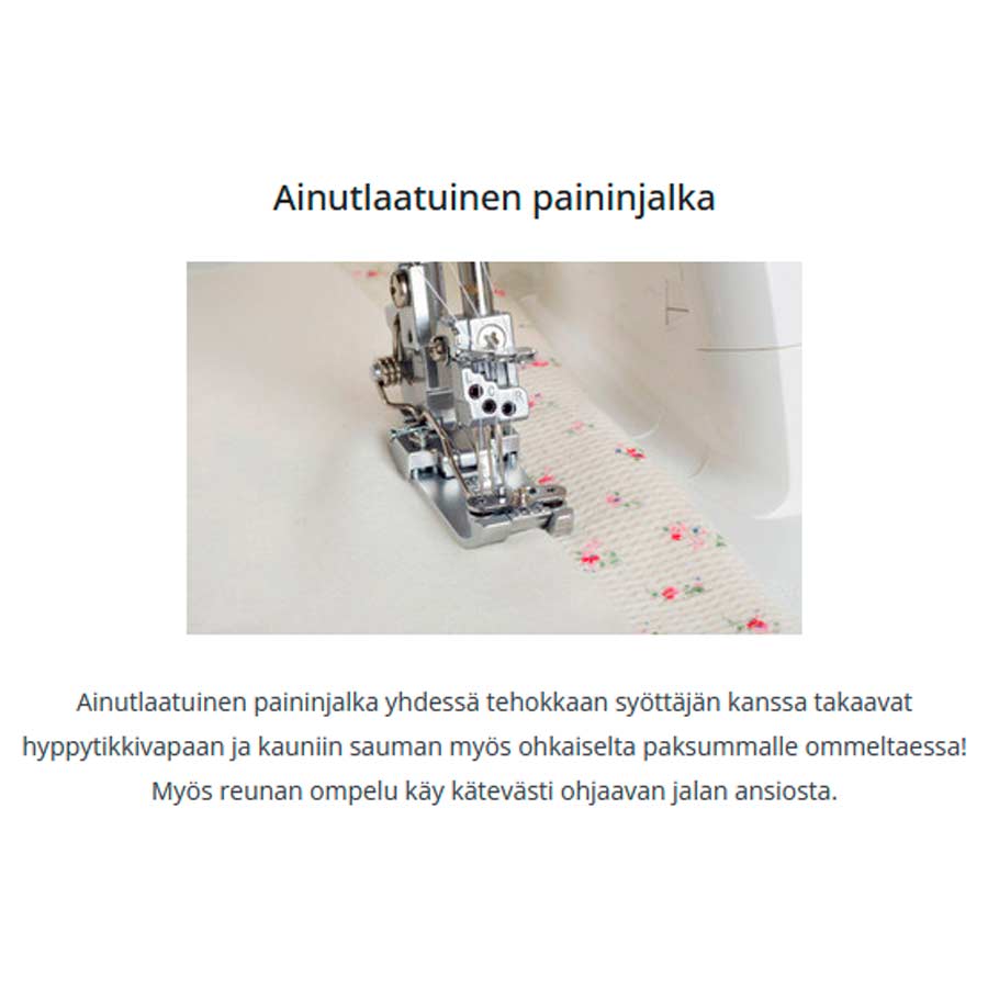 Jukin ainutlaatuinen paininjalka ja vahva syöttö takaavat hyppytikkivapaat, tasaiset saumat kaikenlaisille materiaaleille. Tämä kone tekee nopeasta ja ammattimaisesta vaateompelusta todellisuutta.