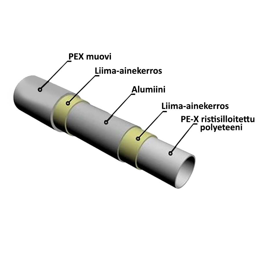 Mekaanisesti vahva kolmikerrosrakenne, PEX (ristisilloitettu polyeteeni) – AL (alumiini) – PEX (ristisilloitettu polyeteeni). Alumiininen happidiffuusiosuoja estää kaasujen (hapen) siirtymistä putken seinämän läpi lämmitysverkoston veteen (DIN 4726 ≤ 0,1 g/m³/vrk).