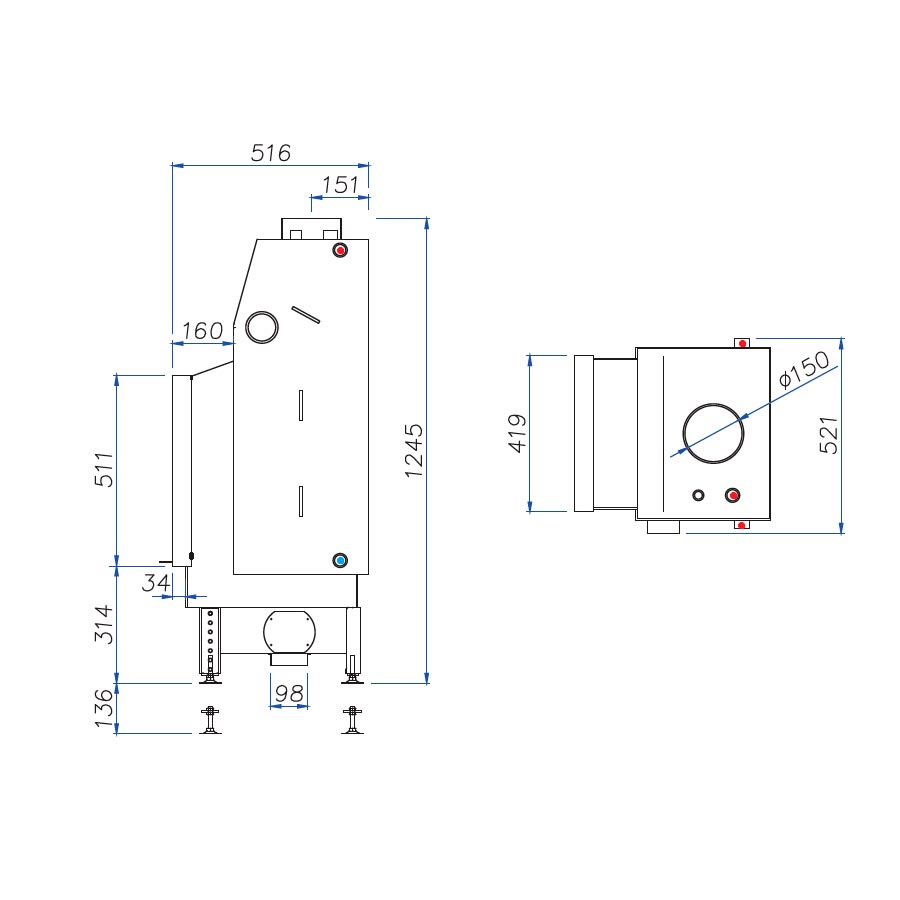 Vakiona säätöjalat, ulkoinen paloilmanottoliitäntäpaikka (vasemmalta, oikealta tai alapuolelta). Luukun käsikahvan puoli valittavissa tilauksen yteydessä!